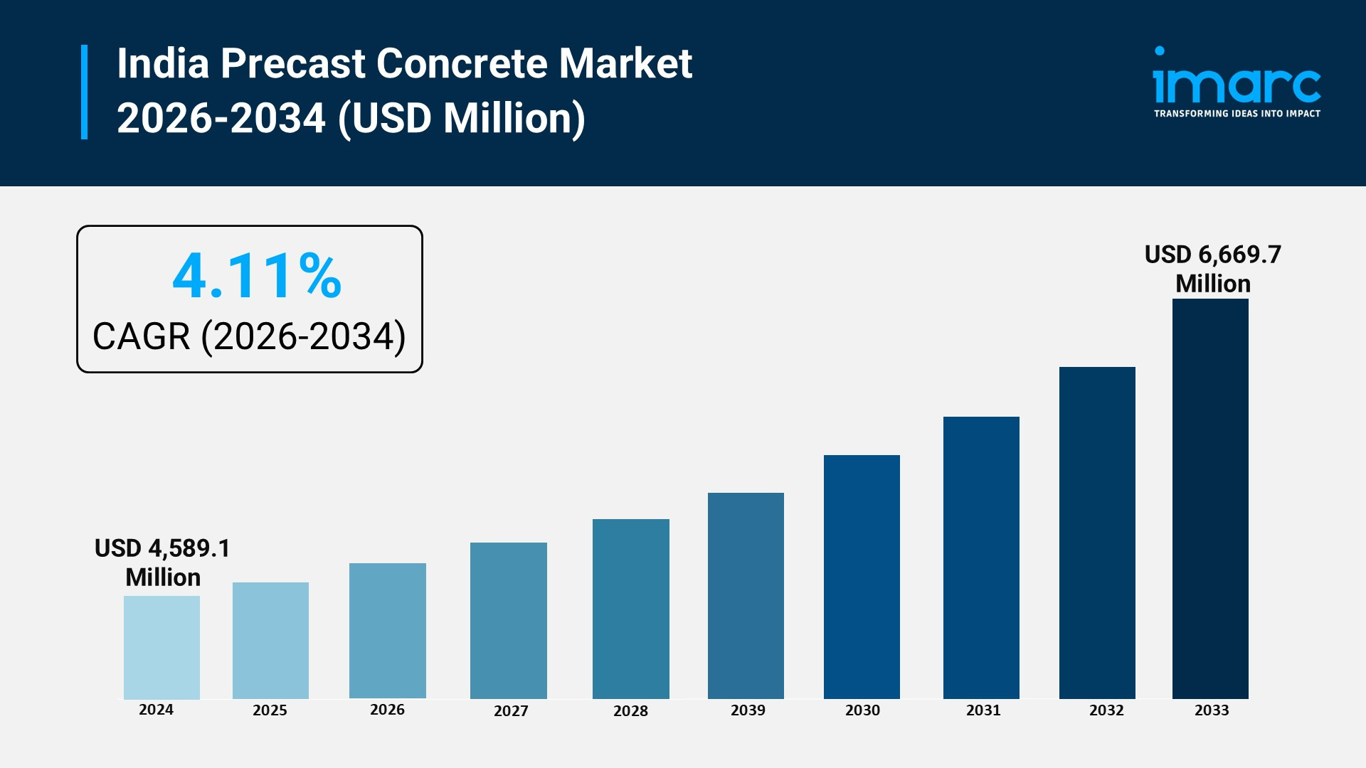 India precast concrete market size reached USD 4,589.1 Million in 2025. Looking forward, IMARC Group expects the market to reach USD 6,669.7 Million by 2034, exhibiting a growth rate (CAGR) of 4.11% during 2026-2034.
